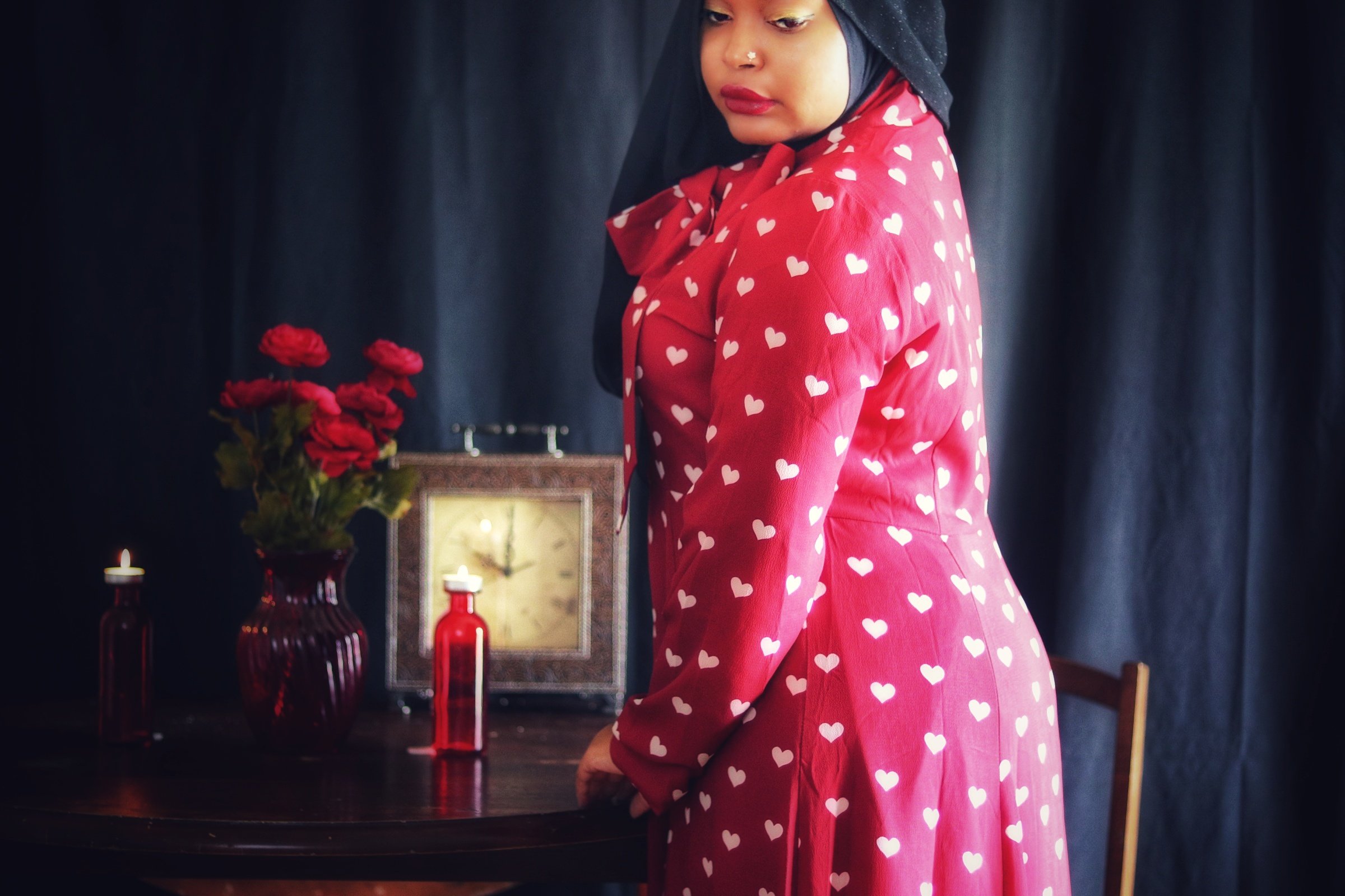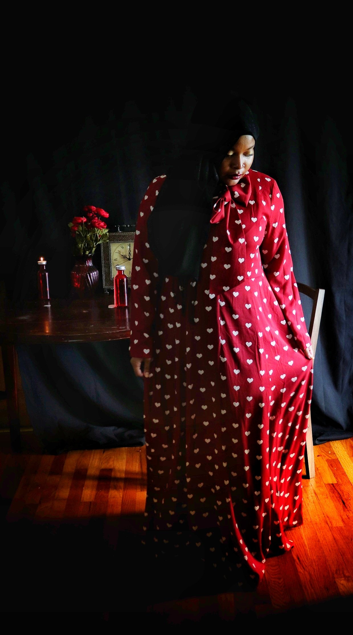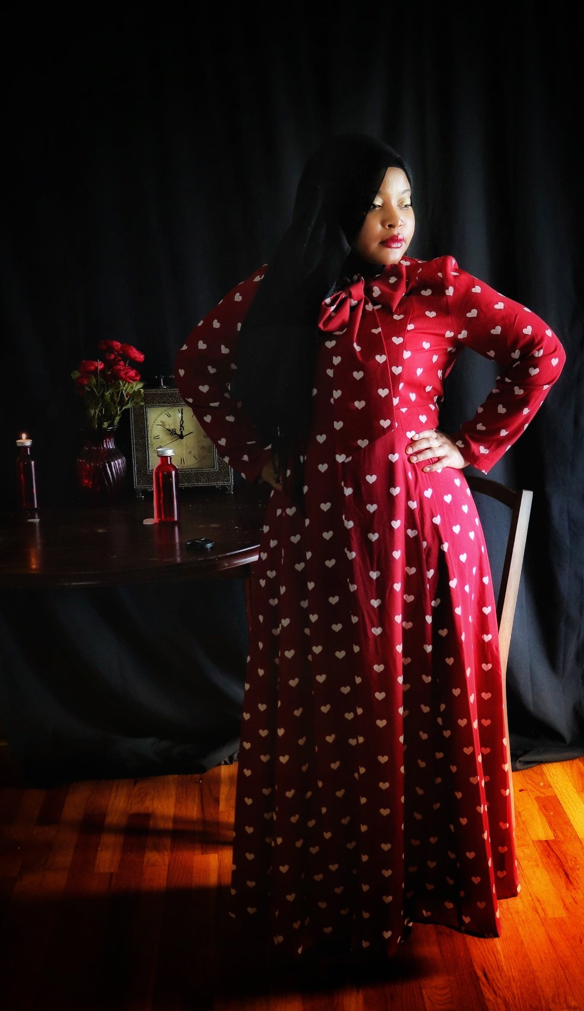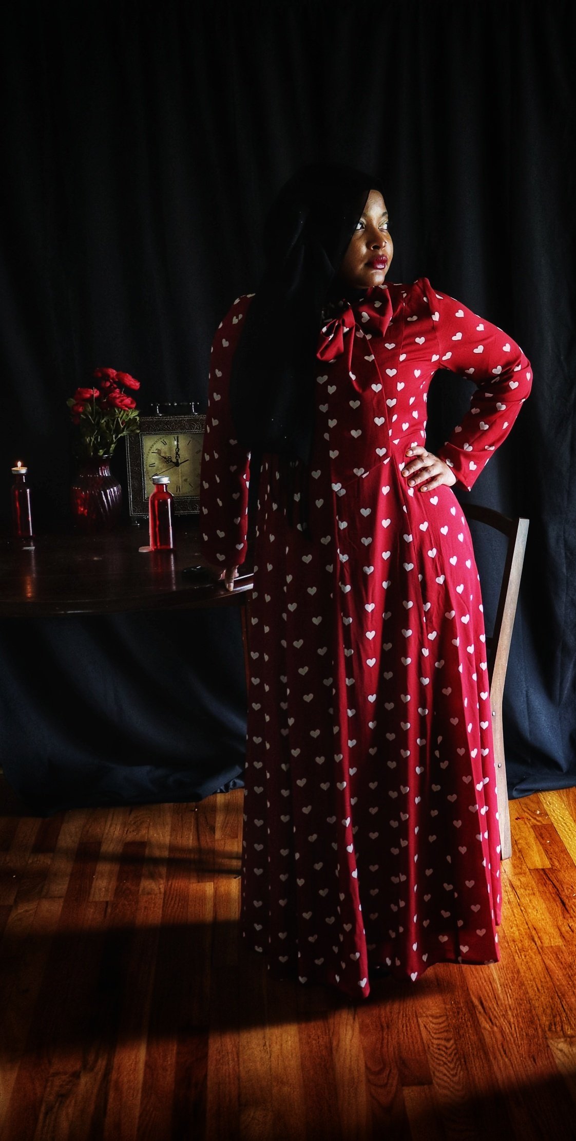 When I first opened the package containing the crimson dress covered in a pattern of white hearts, my immediate thought was “Date Night”. But after quick contemplation, I realized I would not be able to accurately depict something photographically that is beyond my experience. I therefore opted for “Stood Up” as the inspiration for the photo shoot as I have more than enough experience in that arena. (I should also point out that being “ghosted” is the online equivalent of being stood up). Enjoy the story.