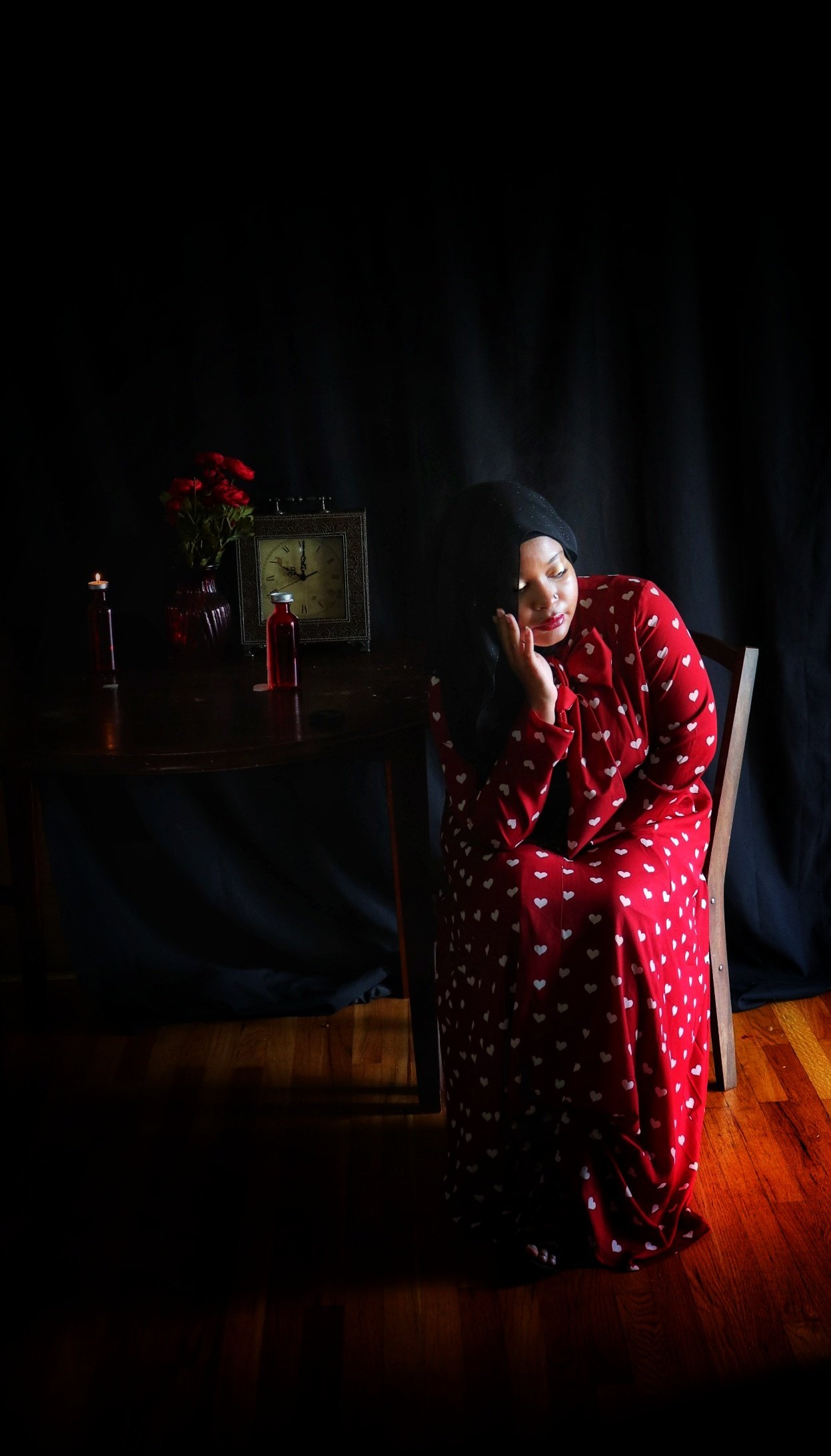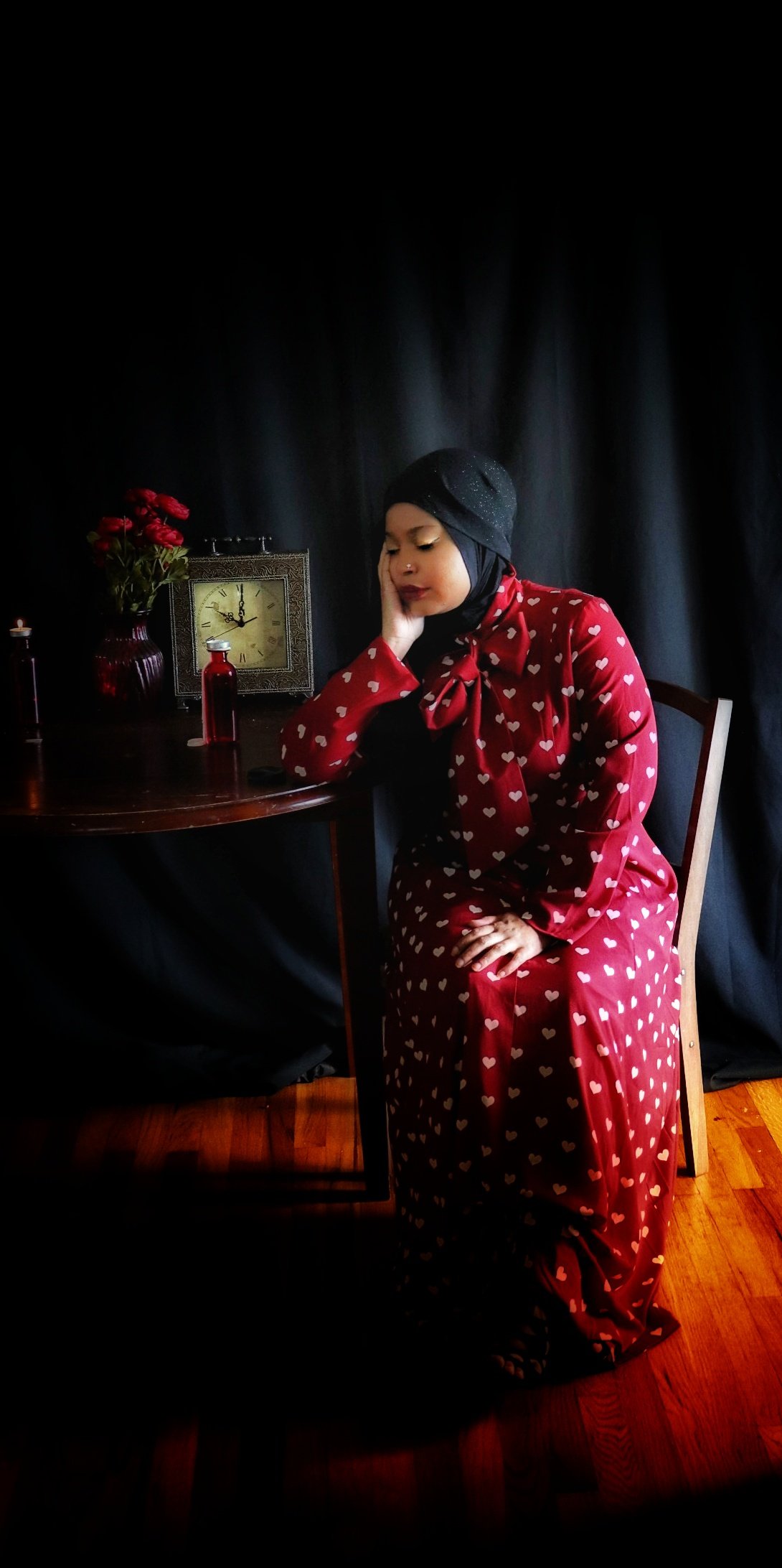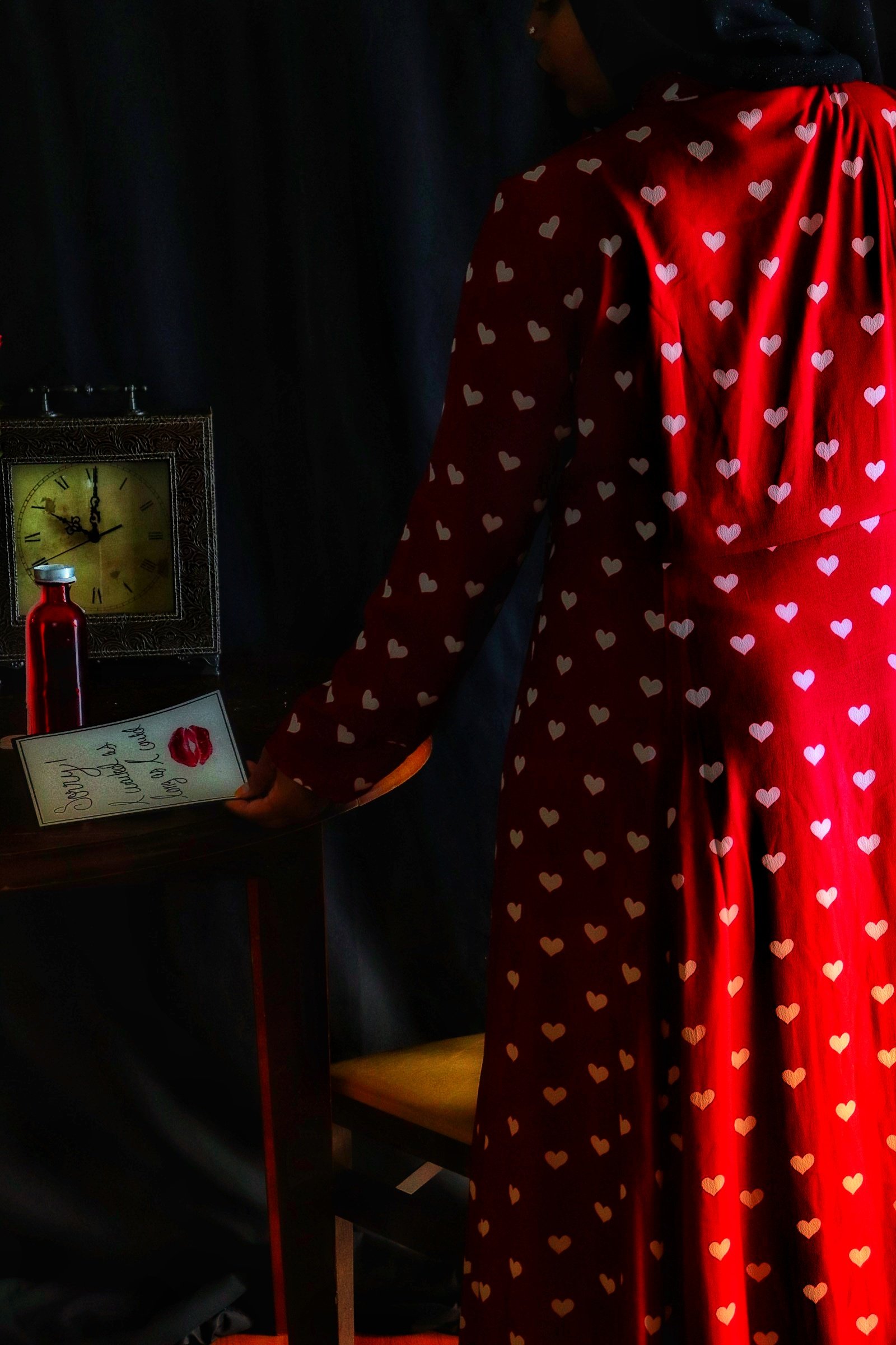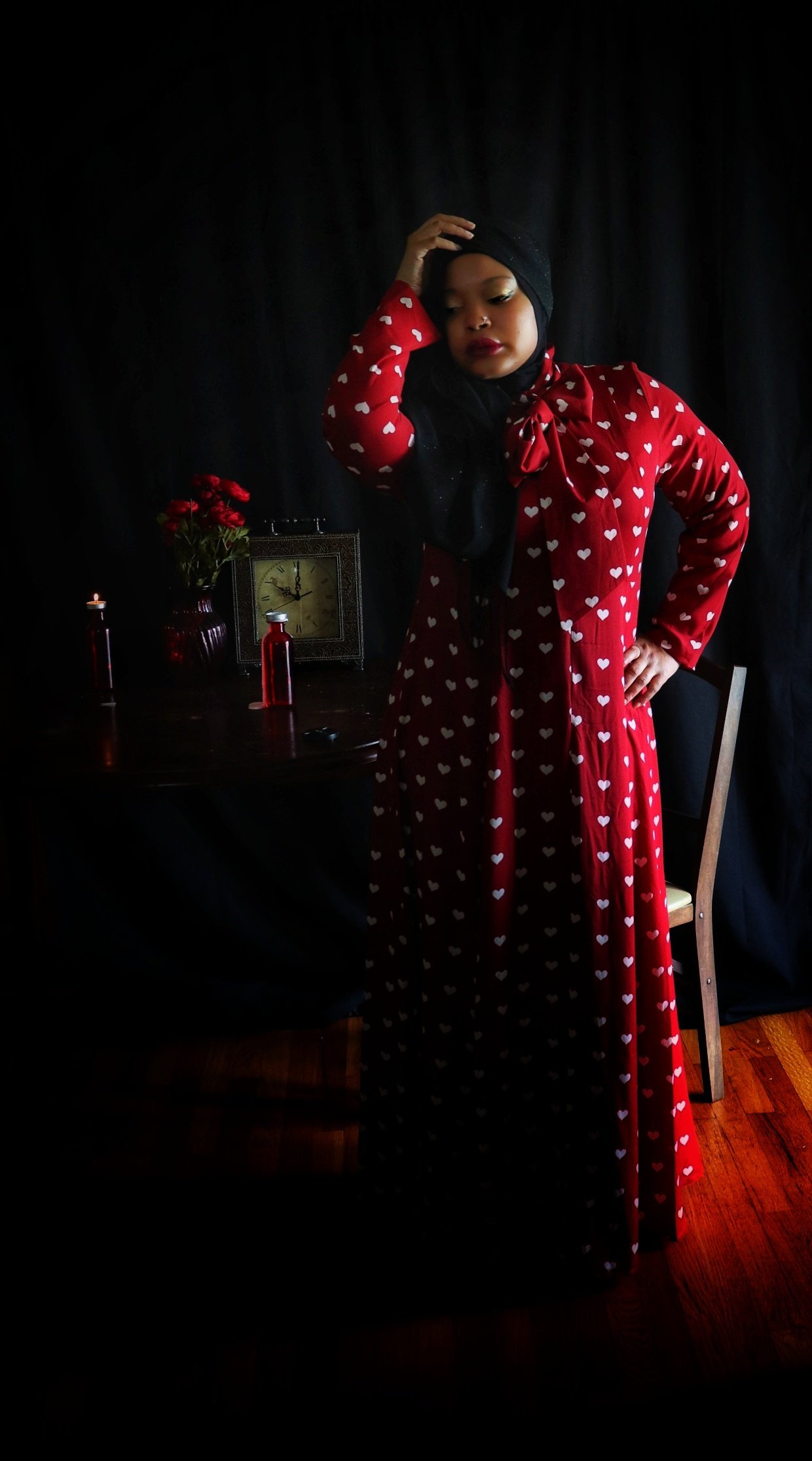 When I first opened the package containing the crimson dress covered in a pattern of white hearts, my immediate thought was “Date Night”. But after quick contemplation, I realized I would not be able to accurately depict something photographically that is beyond my experience. I therefore opted for “Stood Up” as the inspiration for the photo shoot as I have more than enough experience in that arena. (I should also point out that being “ghosted” is the online equivalent of being stood up). Enjoy the story.